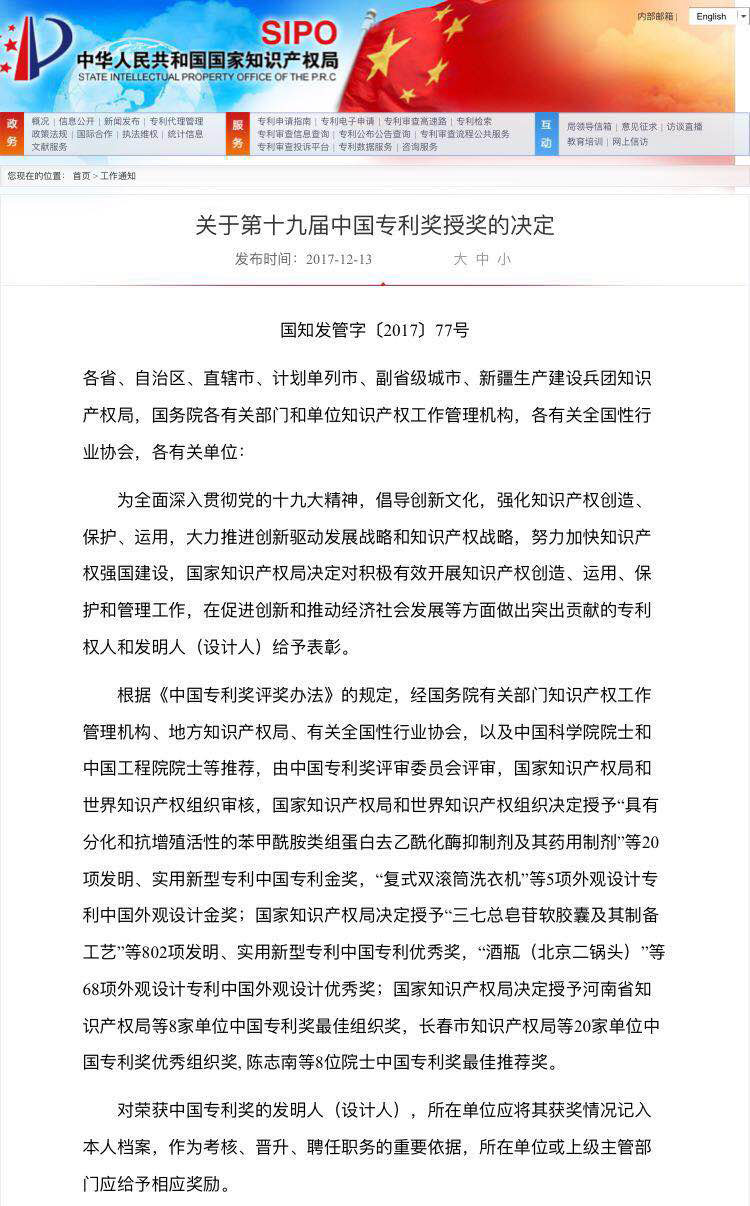 榮獲第十九屆中國(guó)發(fā)明專利優(yōu)秀獎(jiǎng),是孝感歷史上專利榮獲的最高獎(jiǎng)項(xiàng)。
