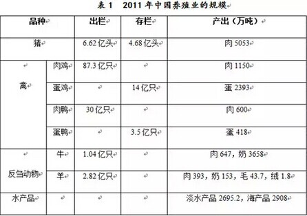 中國是世界上最大的食品動(dòng)物養(yǎng)殖國,養(yǎng)殖規(guī)模大,養(yǎng)殖密度高,環(huán)境污染嚴(yán)重。據(jù)國家統(tǒng)計(jì)局,2011年中國肉類總產(chǎn)量7958萬噸、奶3810萬噸、禽蛋2811萬噸、毛類45.5萬噸、淡水產(chǎn)品2695.2萬噸,具體如表1所示。
