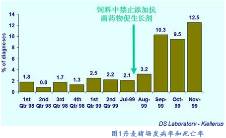 歐盟對(duì)獸用抗菌藥在養(yǎng)殖業(yè)上的使用要求比較嚴(yán)格。瑞典是最早在飼料中禁止添加抗菌藥物促生長劑的國家,從1999年7月1日起歐盟禁止桿菌肽鋅、螺旋霉素、維吉尼亞霉素和泰樂菌素4種抗生素在畜禽飼料中作為生長促進(jìn)劑使用,2006年1月1日起歐盟又禁止所有的抗菌藥物促生長添加劑在養(yǎng)殖業(yè)上使用。然而禁止使用抗菌促生長劑對(duì)動(dòng)物健康和動(dòng)物福利產(chǎn)生了很大的負(fù)面影響,丹麥DANMP的報(bào)道(2000年)指出禁用后丹麥豬場(chǎng)的發(fā)病率和死亡率增加了600%,如圖1所示。禁用后導(dǎo)致整個(gè)歐盟家禽的壞死性腸炎呈流行狀態(tài),飼料報(bào)酬下降,上市體重和整齊度降低,大大提高了生產(chǎn)成本。