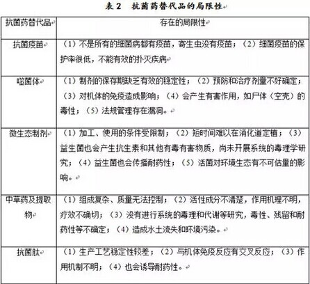 針對(duì)獸用抗菌藥在使用上出現(xiàn)的一些問題,目前出現(xiàn)了一些抗菌藥的替代品,如抗菌疫苗、噬菌體、微生態(tài)制劑、中草藥及其提取物、群體感應(yīng)及生物被膜抑制劑、抗菌肽、酶制劑,雖然這些替代品在使用過程中發(fā)揮了一定的作用,但是由于存在著不同的局限性而影響限制了使用,所以這些替代品是不能完全替代抗菌藥的,具體如表2所示。